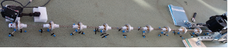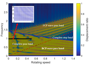 Figure 1: Above: band gaps, Faraday rotation effect, and numerical simulations of one-dimensional gyroscopic metamaterial. Below : experimental setup.